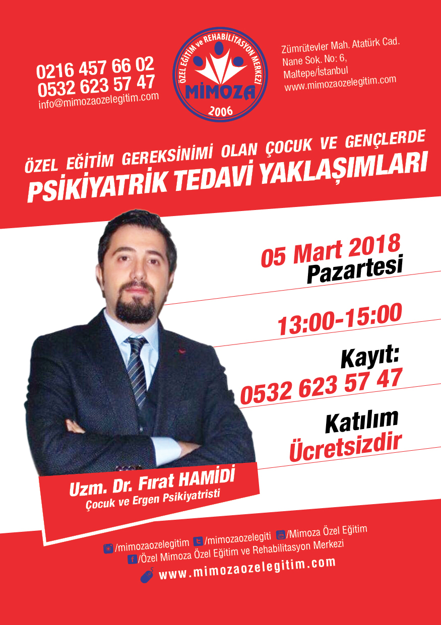 05 Mart 2018 tarihinde kurumumuzda Emsey Hastanesi Çocuk ve Ergen Psikiyatristi Uzm. Dr. Fırat Hamidi hocamız tarafından “ Çocuk ve Gençlerde Psikiyatrik Eğitim Yaklaşımları ” konulu seminer yapılmıştır.
