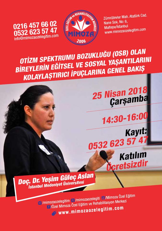 25 Nisan 2018 tarihinde kurumumuzda İstanbul Medeniyet Üniversitesi Öğretim Görevlisi Doç. Dr. Yeşim Güleç Aslan hocamız tarafından “ Otizm Spektrum Bozukluğu Olan Bireylerin Eğitsel ve Sosyal Yaşantılarını Kolaylaştırıcı İpuçlarına Genel Bakış ” konulu seminer yapılmıştır.
